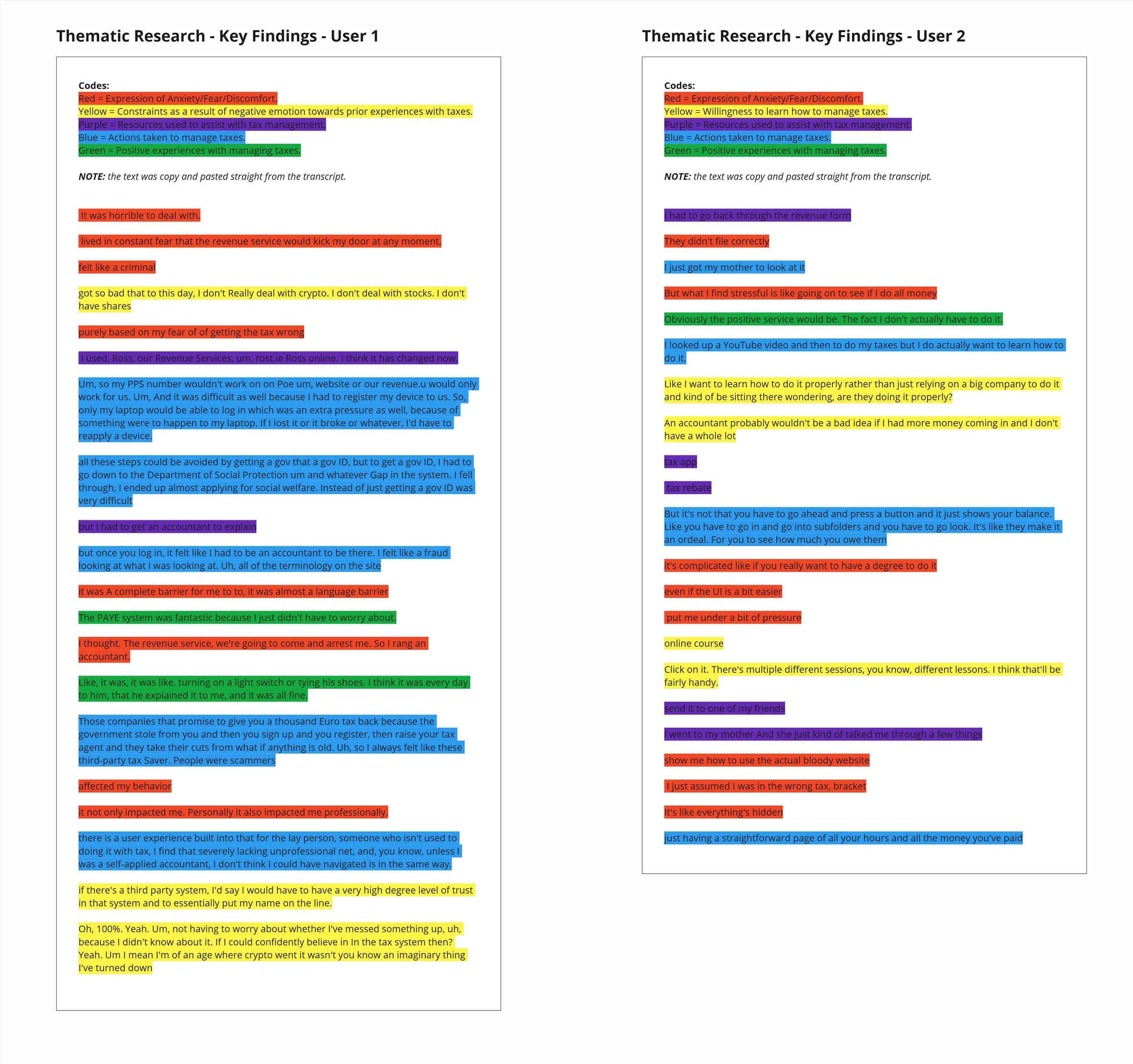 Based on the research insights, users consistently struggled with the complexity of tax language, lack of step-by-step guidance, and an overwhelming user journey on Revenue’s website. Some expressed uncertainty and resorted to costly third-party services despite being eligible to file or claim independently.