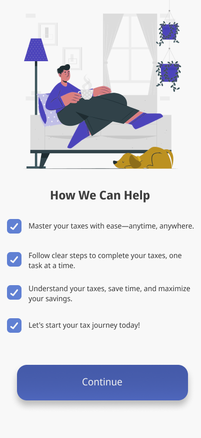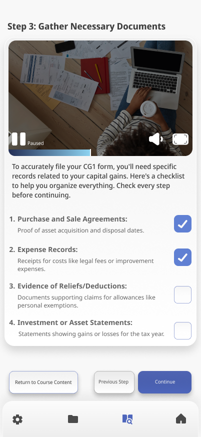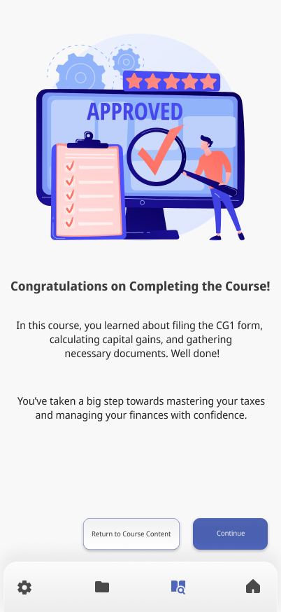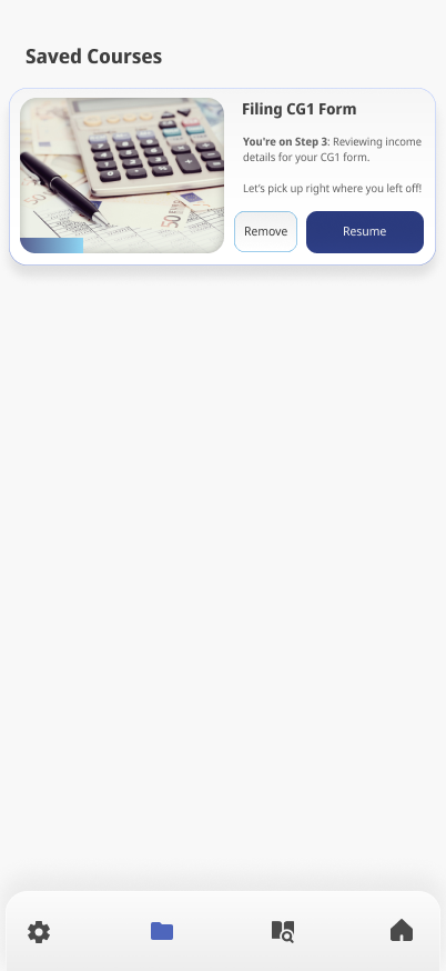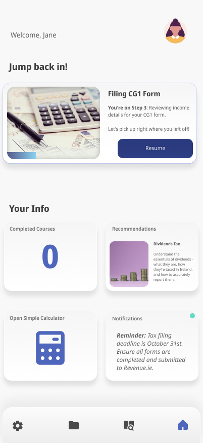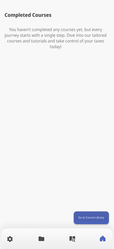 Dashboard: This is the home screen, displaying key information for the user. It includes an unfinished course section with a "Resume" button, allowing users to pick up where they left off. Additionally, it shows completed courses, recommended courses, a simple tax calculator for quick calculations without leaving the app, and relevant notifications to remind users of important dates and activities.