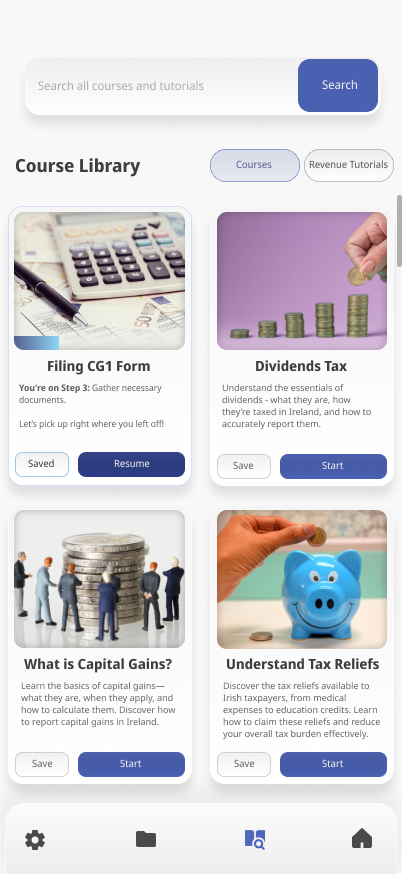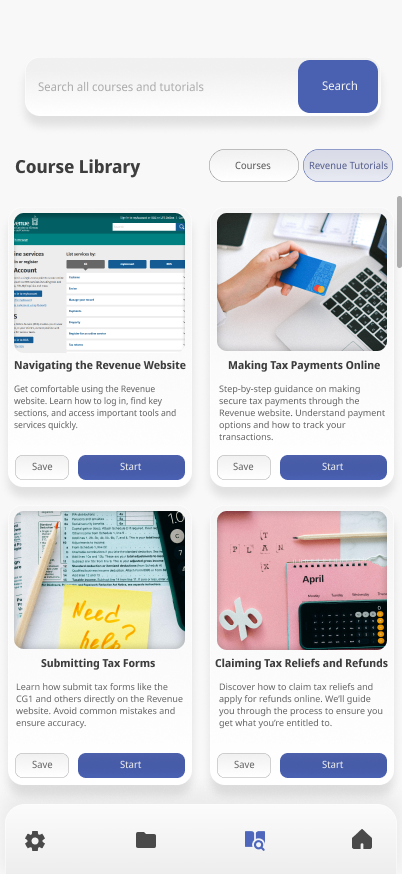 Course Library (Courses): This section is divided into two parts: Courses and Revenue Tutorials. Here, users can browse, save, start, or resume courses that teach various aspects of the Irish tax process. Users can easily switch using the “Courses” and “Revenue Tutorials” button.