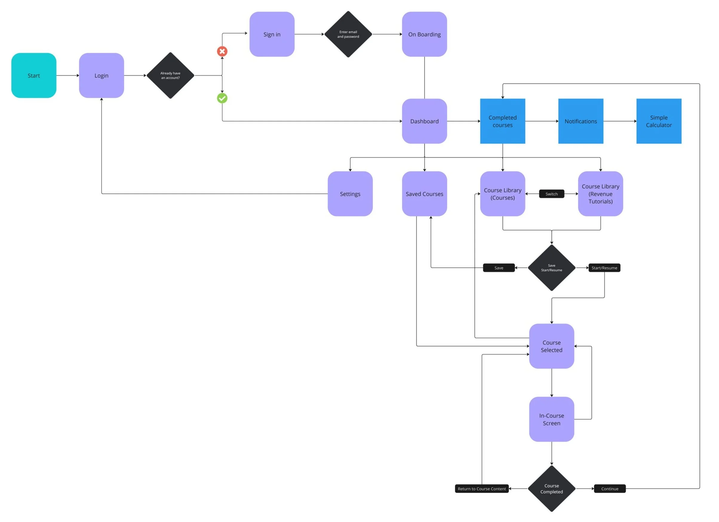 To translate the persona’s goals into a functional experience, I created a user flow showing the intended interaction with the app—from onboarding through tutorial completion.