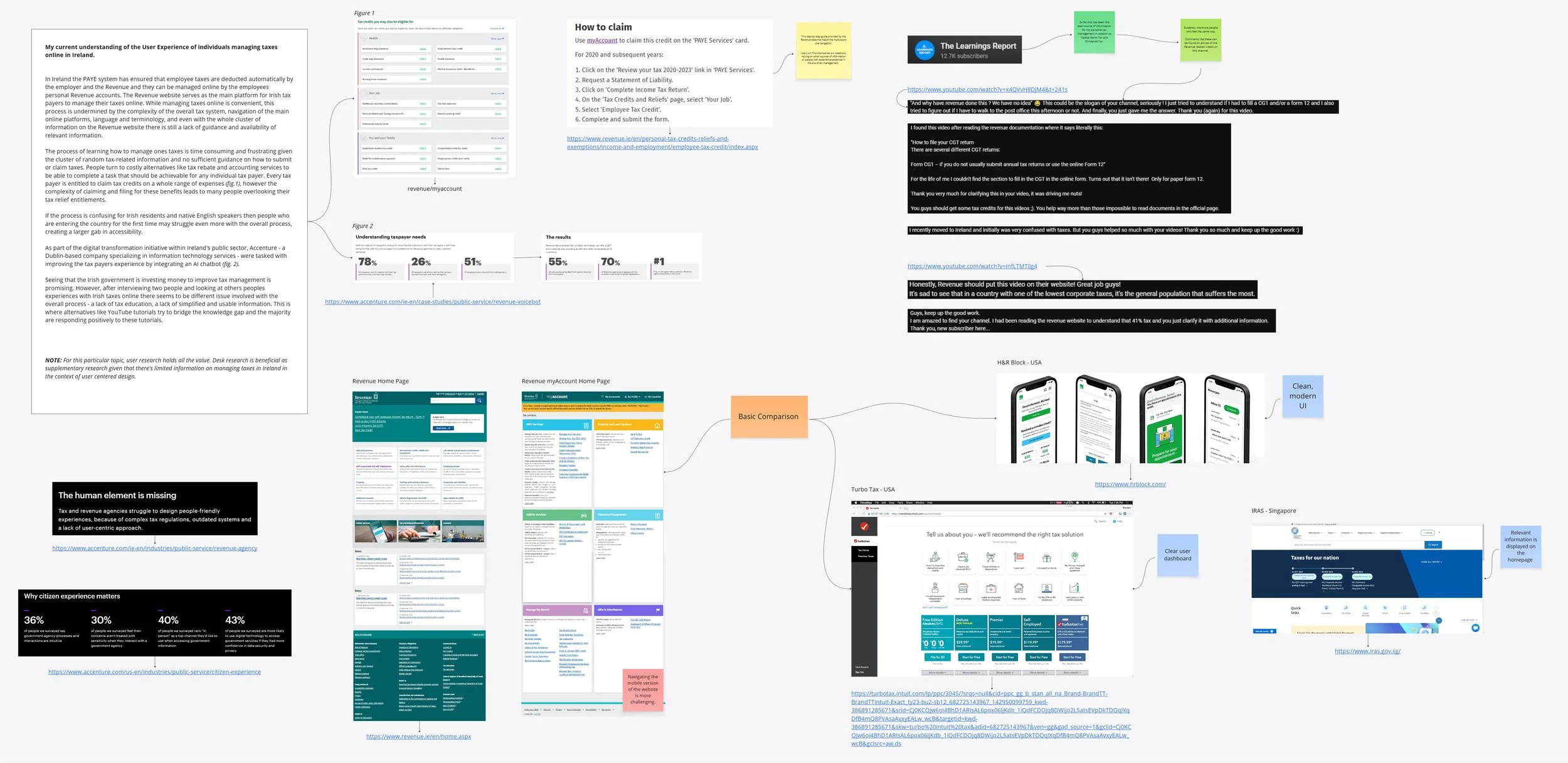 Managing taxes online through Ireland’s Revenue platform is convenient in theory, but in practice, users often feel overwhelmed by the complexity of the system. Desk research revealed several pain points: unclear language and terminology, poor guidance, scattered information, and a general lack of educational support on how to claim entitlements or submit returns.